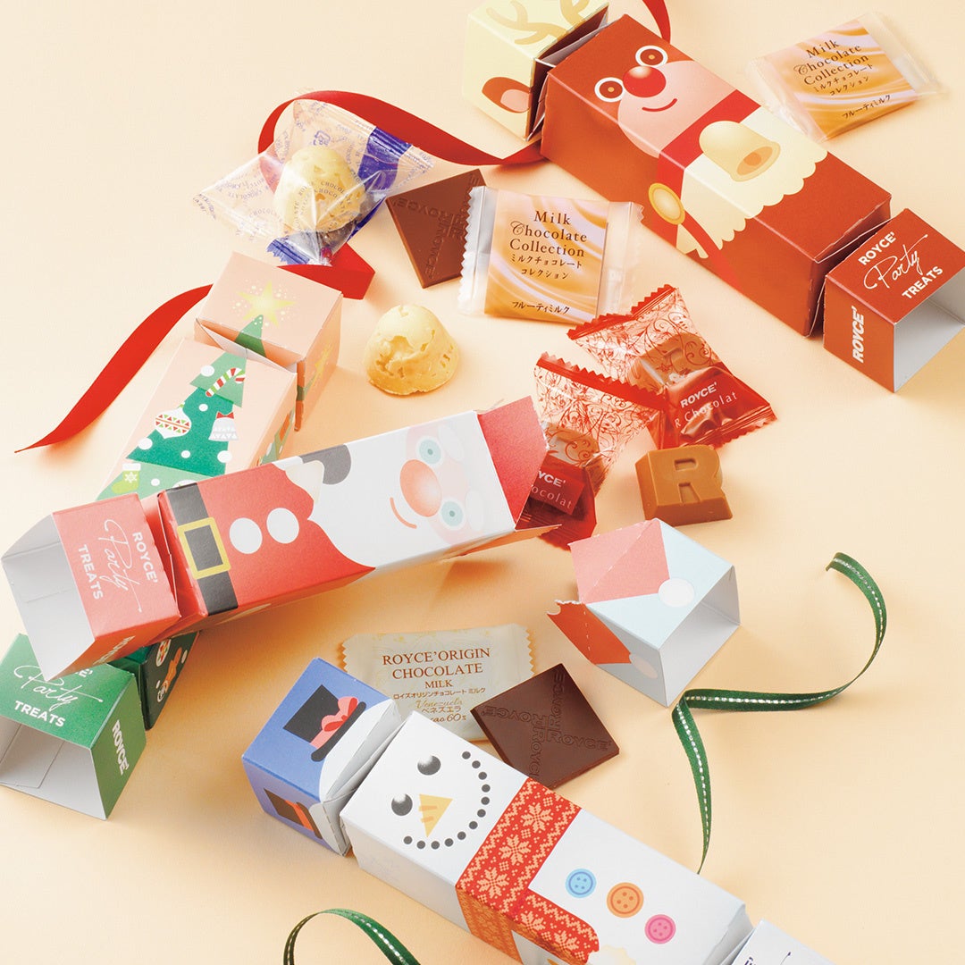 サンタやツリーなどをデザインしたカラフルな小箱の両端を引っ張り合うと、中からチョコレートが飛び出します。スティック状の小箱は小分けのプレゼントとして配るのもおすすめ。クリスマスパーティにぜひお使いください。