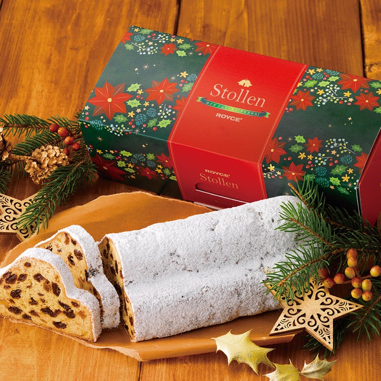 ロイズの定番人気のシュトーレンが、クリスマス限定パッケージで登場。洋酒に漬けたレーズンや糖漬けのフルーツ、ナッツを、ほんのりシナモンが香る醗酵生地に混ぜて焼き上げました。日増しに生地がなじみ、しっとりとしたおいしさに深まっていきます。
