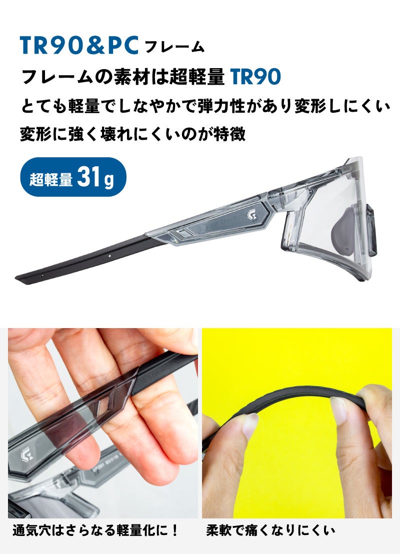 材質 | PC調光レンズ、PCテンプル、TR90ゴムフレーム |