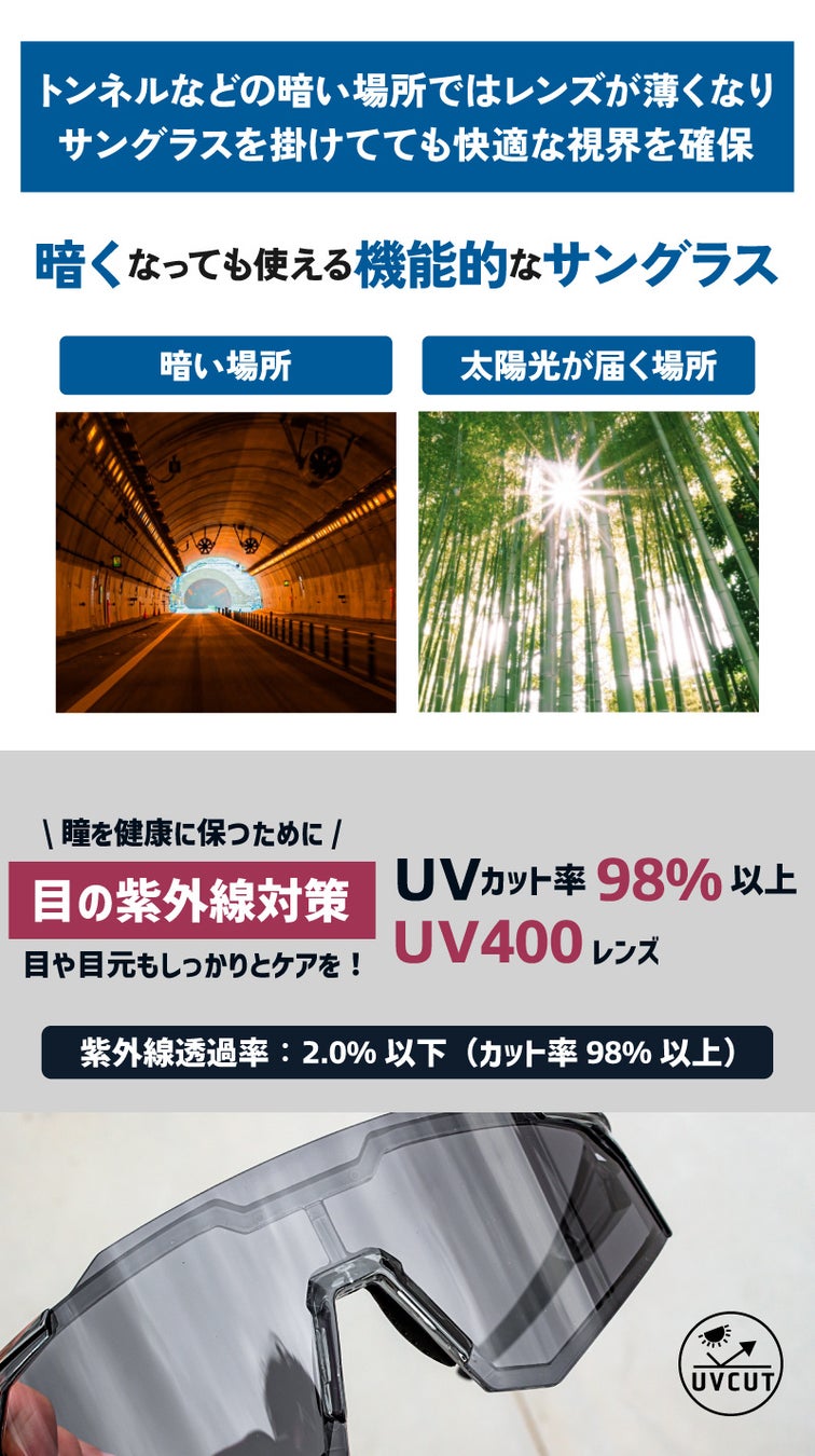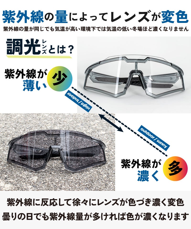 太陽光や紫外線から目を保護しつつ暗くなっても使える機能的な調光サングラスです。