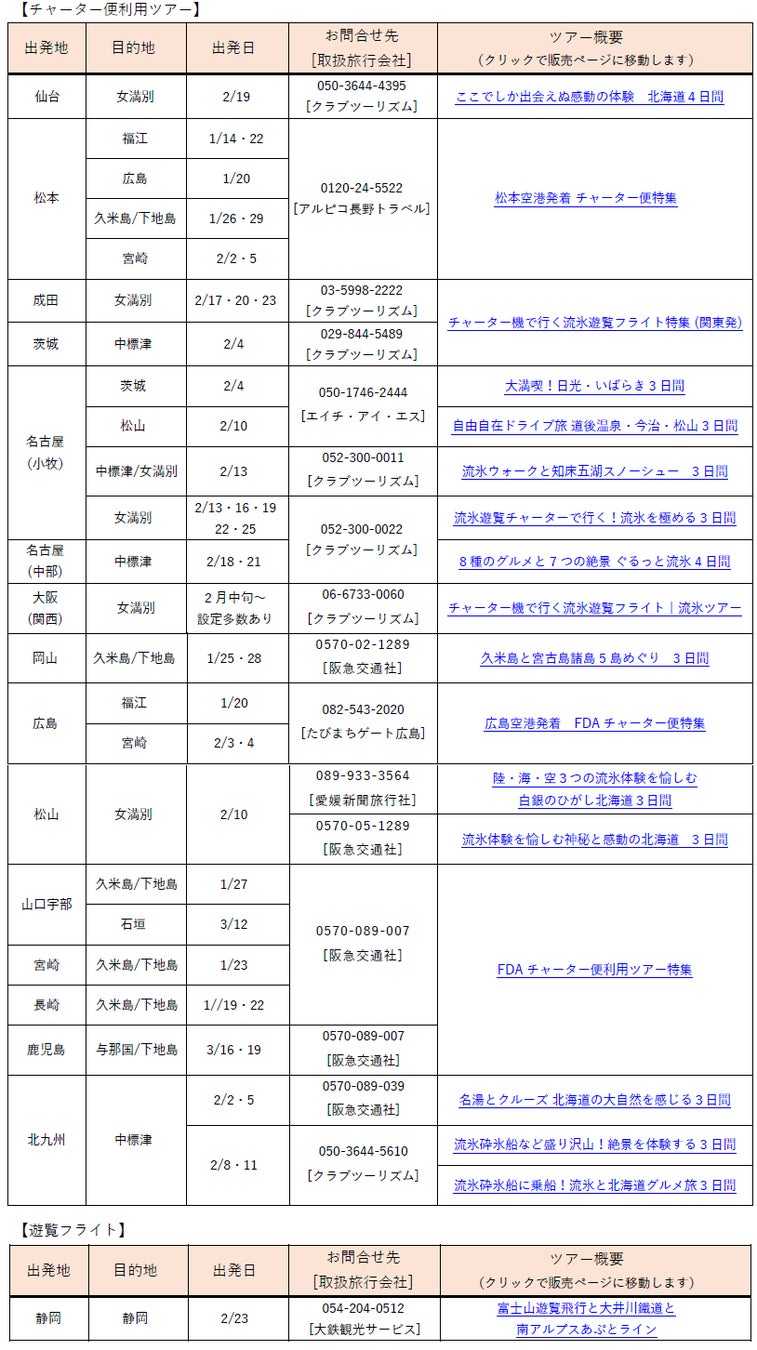 上記は、現在一般販売している旅行ツアーの一部となります。全てのチャーター便・遊覧フライトの運航予定を記載しているものではありませんのでご了承ください。