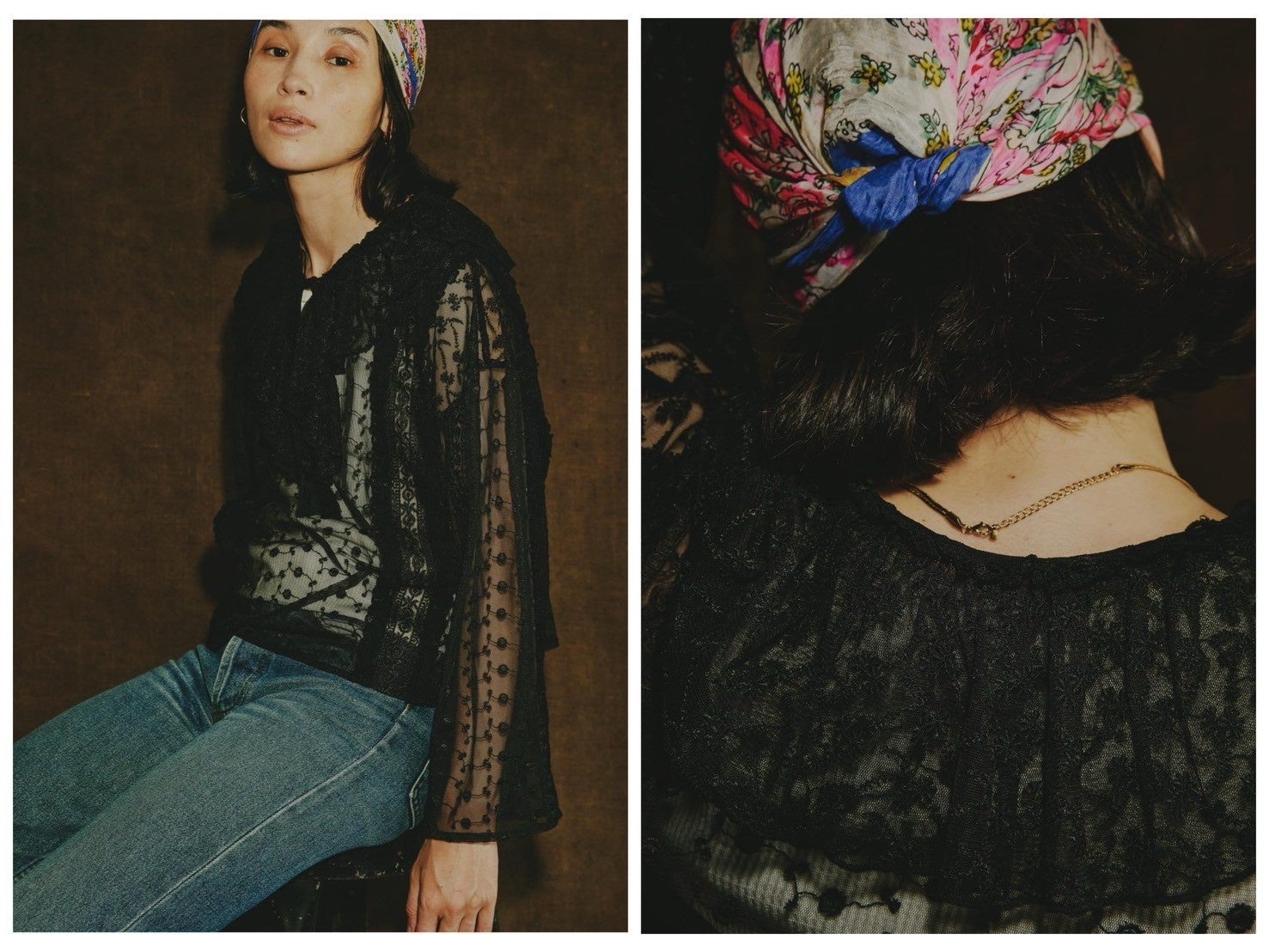 2柄のチュールレースにオーガンジーテープのレースや、アンティークレースを加えた甘いテイストのブラウス。クラシックな印象で、夏の終わりにちょうど良い素材感の1枚に。