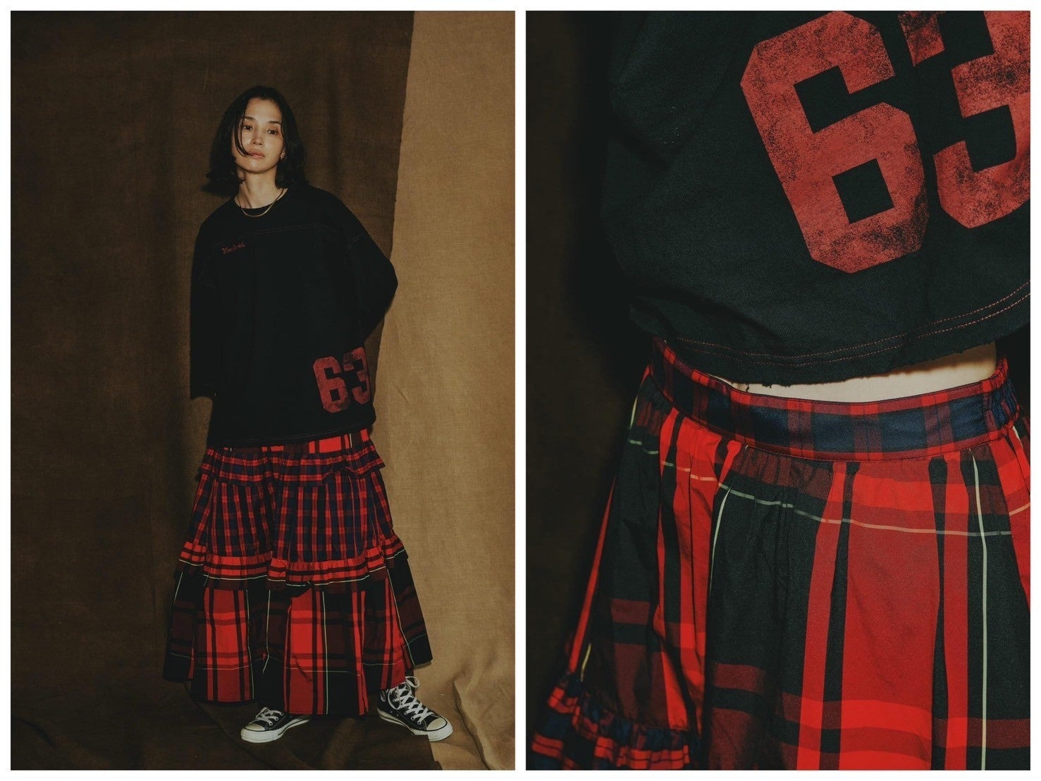 張り感のある合繊素材で、赤チェックを2柄組み合わせたもの、同じく黒チェックを組み合わせたもの、黒の微配色の3色展開。