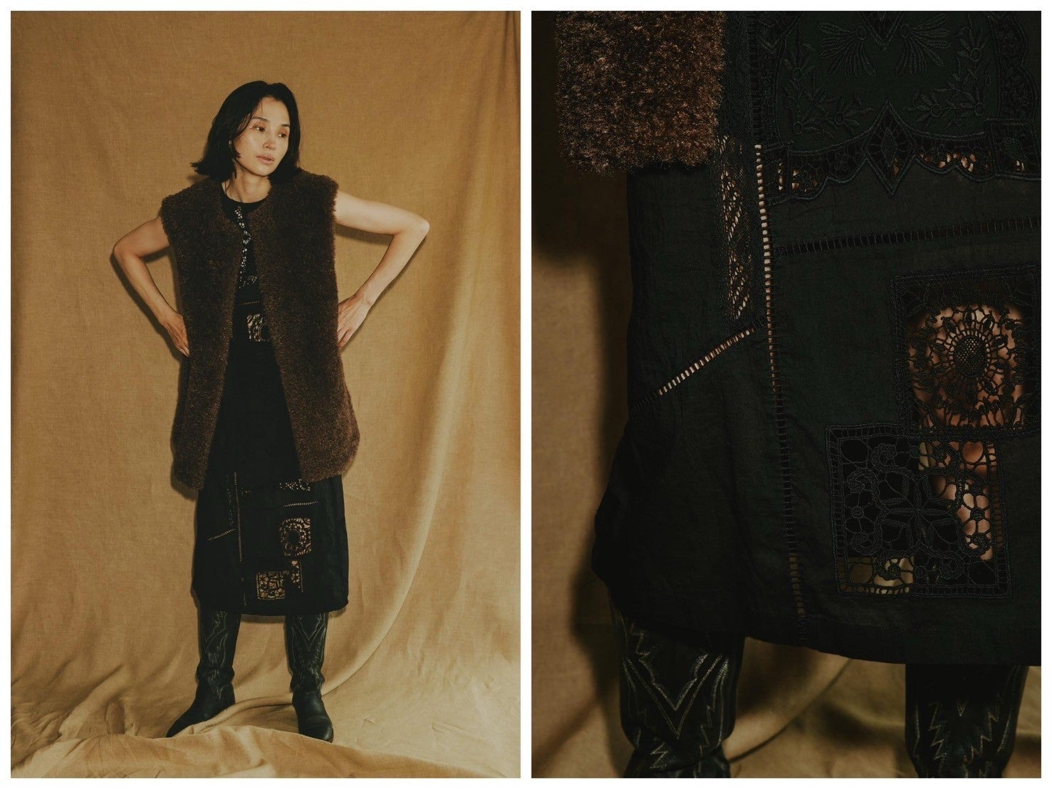 スクエアとサークルのレースをたっぷりとあしらったワンピース。ストンと落ちるIラインのシルエットと、さりげないアメリカンスリーブで健康的な肌見せと秋色カラーがポイント。