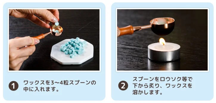 セットには、直径20ミリか25ミリが選べるシーリングスタンプの印面、パステルカラーの8色から選べるかわいいハンドルが各1個。さらに14色から選べるワックスが50粒、ワックスを熱するためのスプーンが付属します。
