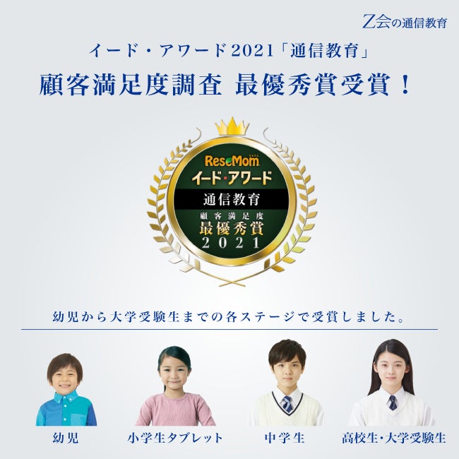 株式会社増進会ホールディングス(Z会グループ)のグループ会社である株式会社Z会は、株式会社イードが発表したイード・アワード2021「通信教育」顧客満足度調査で、幼児・小学生(タブレット)・中学生・高校生の各ステージにおいて最優秀賞を受賞しました。