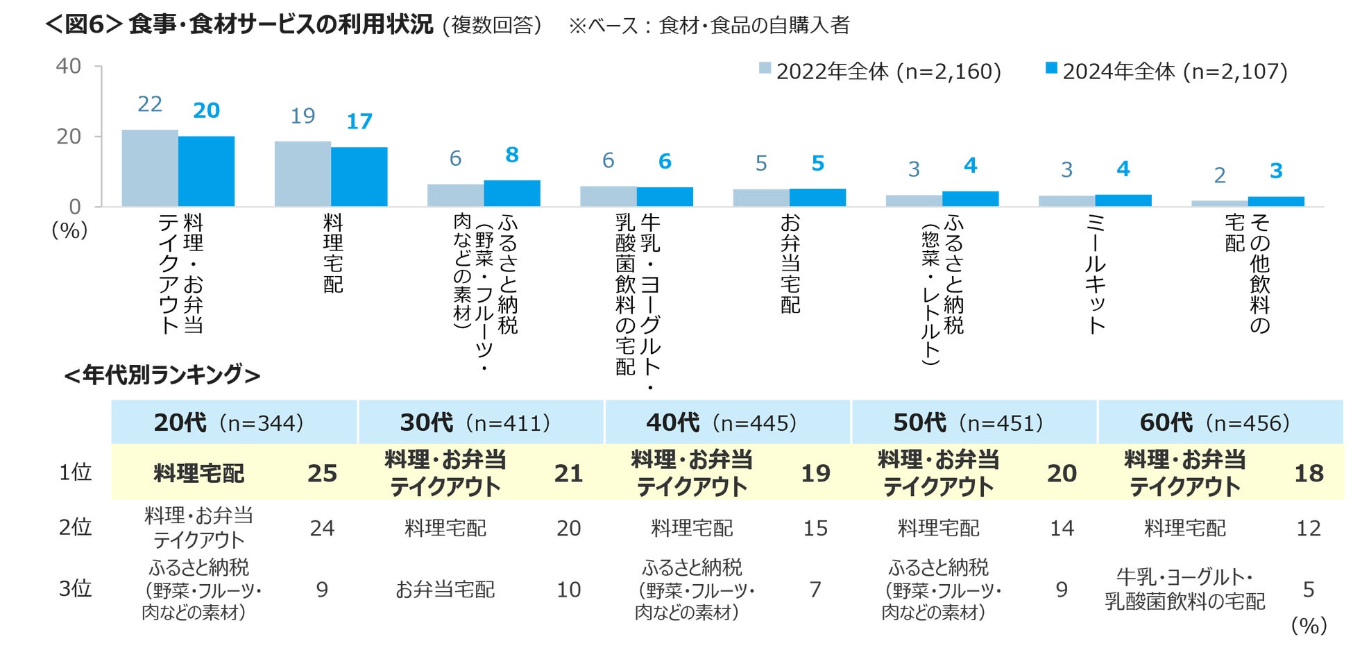 食事や食材に関するサービスの利用率は、「料理・お弁当のテイクアウト」20%、「料理宅配」17%が高い。20代のみ、テイクアウトよりも、フードデリバリーの利用割合がわずかに上回る結果であった。<図6>