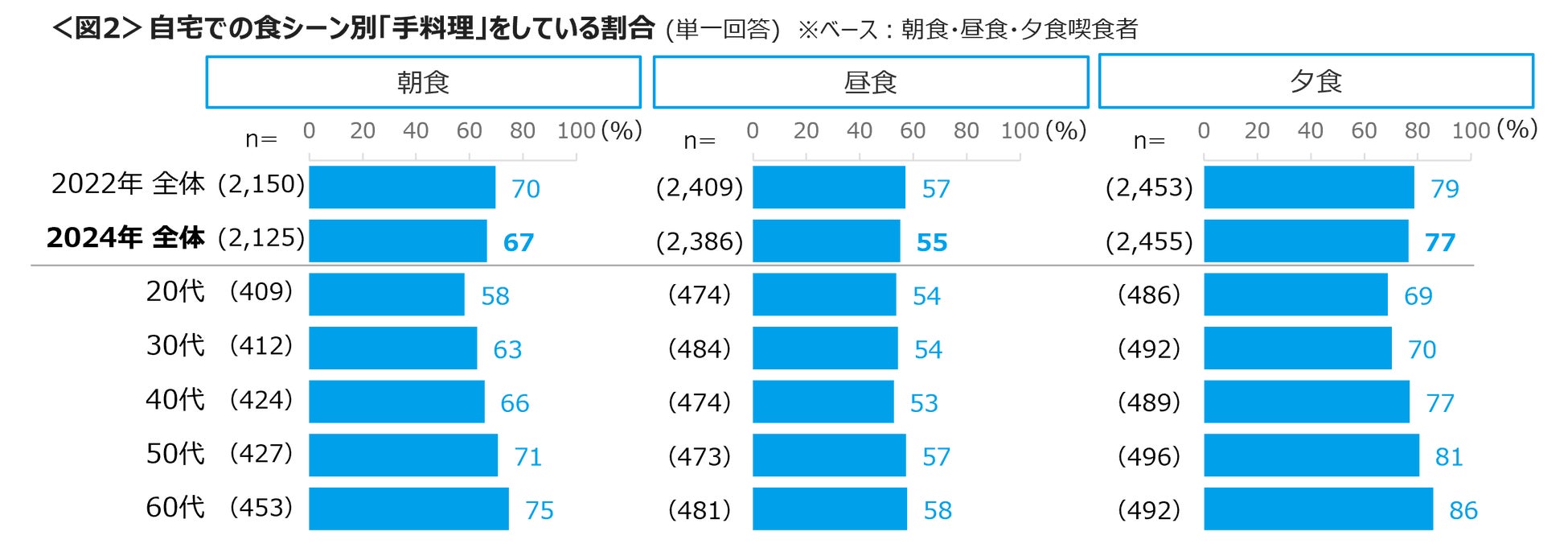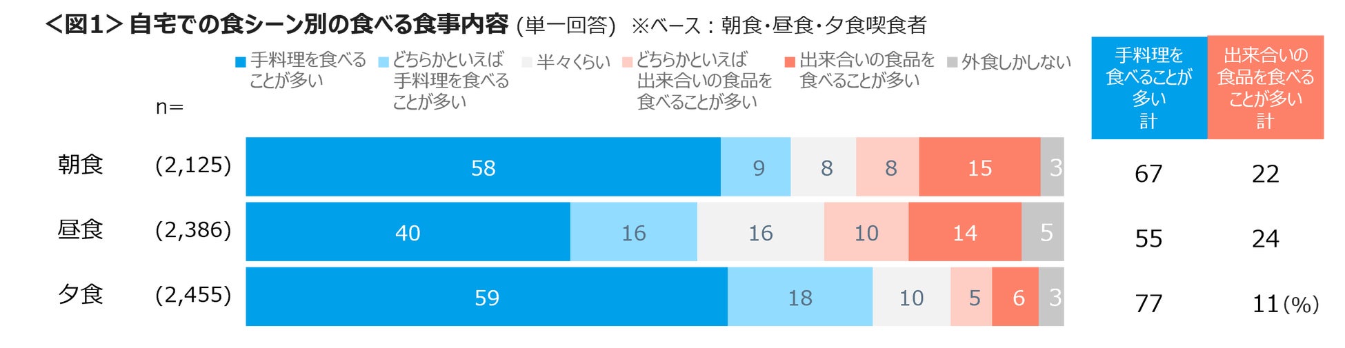 自宅で食事をする際は、朝食、昼食、夕食ともに「手料理」をしている割合が高く、夕食は77%を占めた。手料理率は年代があがるほど高まる傾向にある。<図1,2>