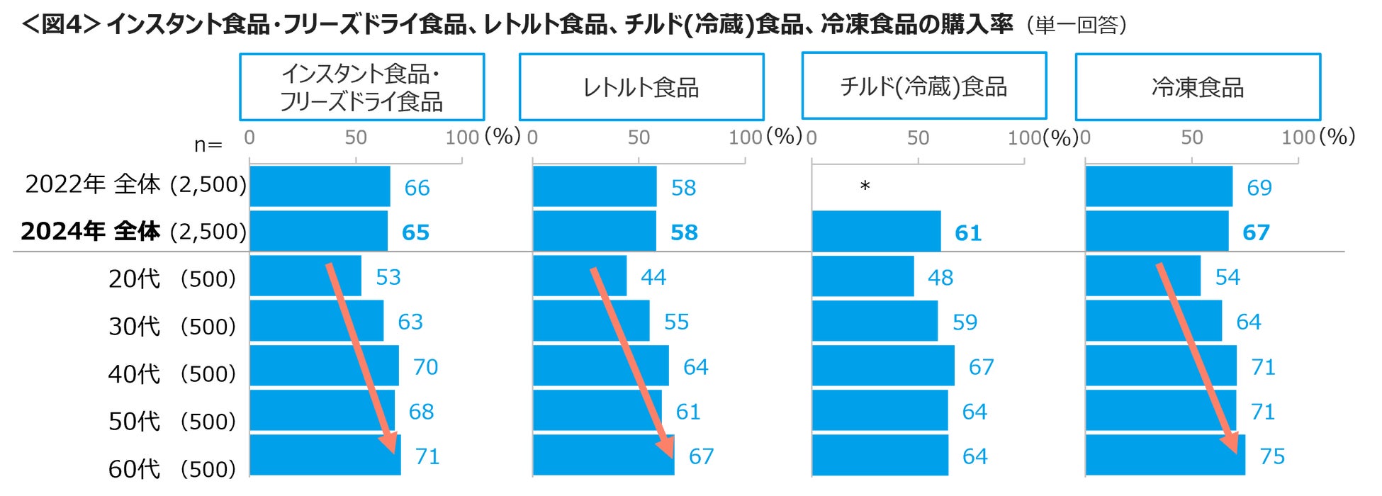 常温保管のできるインスタント・フリーズドライ食品、レトルト食品と冷蔵・冷凍保存が必要な食品の購入率は、「冷凍食品」67%、「インスタント・フリーズドライ食品」65%、「チルド(冷蔵)食品」61%、「レトルト食品」58%であった。20代はいずれも購入率が最も低く、特に「レトルト食品」「チルド食品」は、洗い物など一手間かかることからか5割に満たなかった。一方、40代は「レトルト食品」「チルド食品」の購入率が高い。<図4>