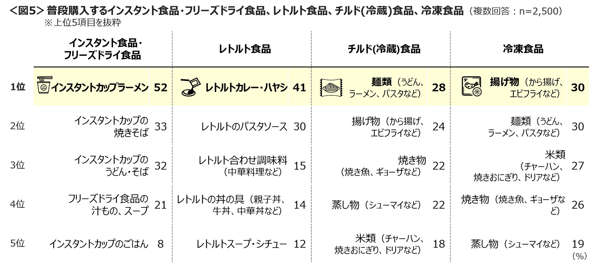 具体的な購入商品は、「インスタントカップラーメン」52%が最も多く、次いで「レトルトカレー・ハヤシ」41%、「インスタントカップの焼きそば」33%、「インスタントカップのうどん・そば」32%など、常温保管ができ賞味期限が長めのものがあがった。<図5>
