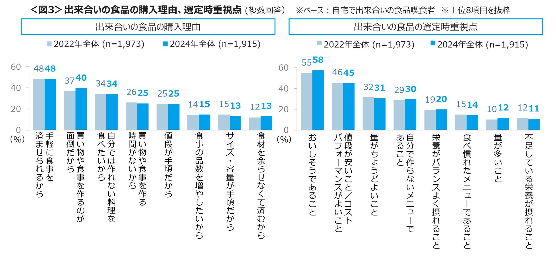 お総菜など出来合いの食品の購入理由は「手軽にすませたい」「買い物や食事作りが面倒」「自分では作れない料理を食べたい」、選定時重視点では「おいしそう」「値段が安い」「量がちょうどよい」がTOP3にあがる。コロナ禍の2022年より大きな変化は見られなかった。<図3>
