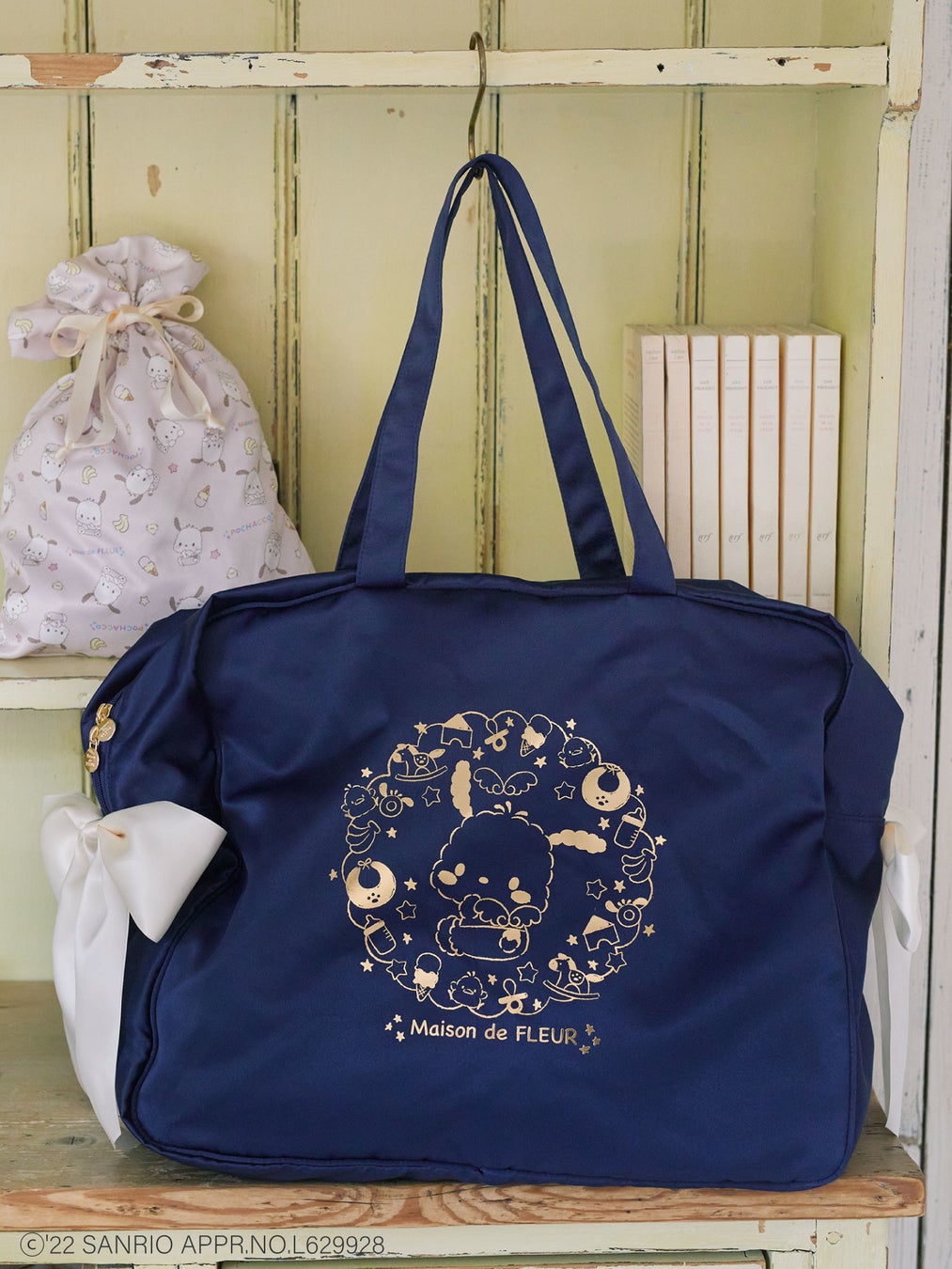 本コラボの一押しは、肩に掛けられるトート型のキャリーバッグです。チャームポイントの背中の羽根を広げながら見返りポーズを取り、指をくわえるしぐさがたまらなく可愛いポチャッコを箔プリントしました。キャラクターの周りには、お友達のピーチャンズやバナナ、おもちゃなどをリースのように配しています。Maison de FLEURらしいサイドのリボンのアクセントもポイントです。背面には、トロリーバッグのハンドルに通せるホルダーが付いています。折りたたんで付属の巾着ポーチに収納し、携帯してサブバッグとしてお使いいただくのもおすすめです。