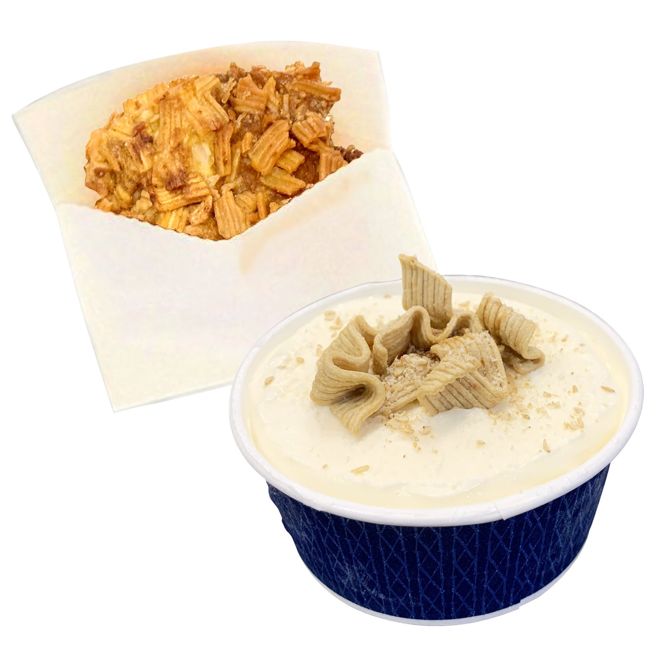 森永乳業のカップアイス「MOW(モウ)バニラ」に、「素材市場いわしのスナック」をトッピングした、ちょい足しアレンジ