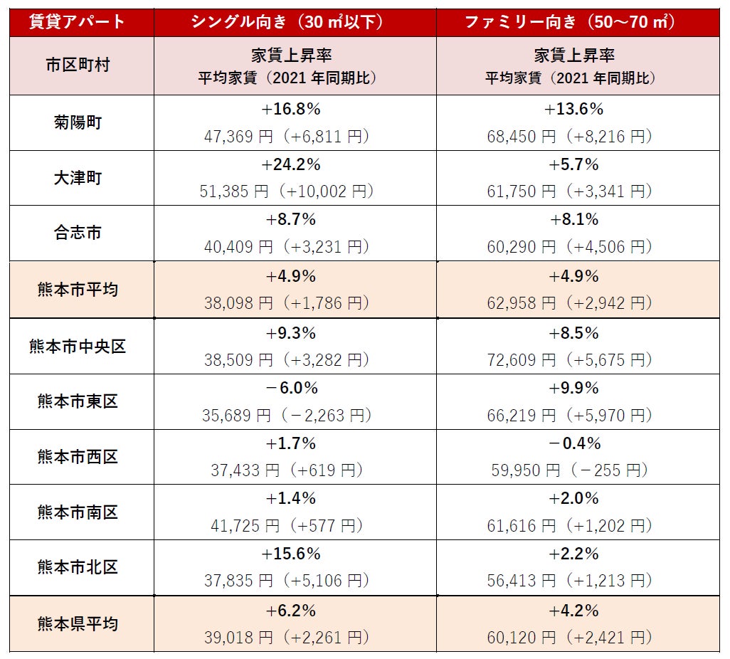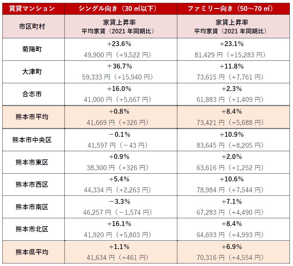 菊陽町・大津町のシングル向きマンション家賃上昇率は2021年比20%超