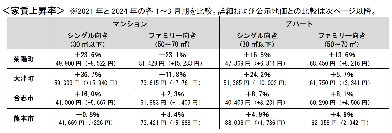 ■マンションの家賃は、大津町のシングル向きで+36.7%と、菊陽町と大津町ではシングル向き・ファミリー向きともに2桁の上昇率となった。両町の平均家賃は熊本市より高くなった。