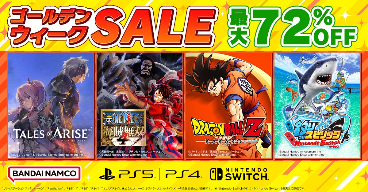 PlayStation™Storeにて株式会社ソニー・インタラクティブエンタテインメントが主催するセール『Golden Week Sale』では、セール期間中、「Tales of ARISE」が35%OFFの5,705円(税込)、「ONE PIECE 海賊無双4」は42%OFFの4,976円(税込)、「ドラゴンボールZ KAKAROT」が55%OFFの3,762円(税込)になるなど、バンダイナムコエンターテインメントのダウンロード版ゲームがお得な価格でお買い求めいただけます。また、PlayStation®Plus加入者のお客様はよりお得にご購入いただける作品もございます。