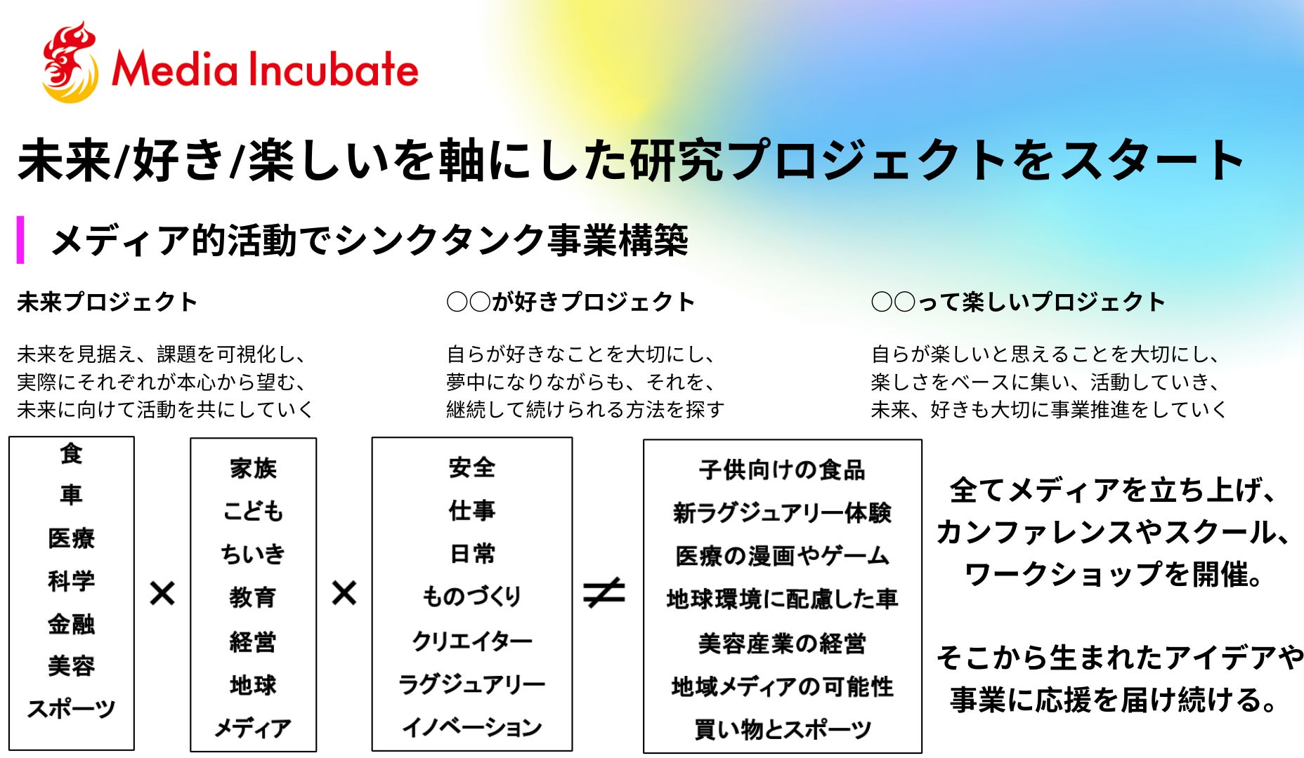 メディアインキュベートは、メディアのアップデートを志し、メディアの事業開発と、メディアで事業開発を⾏っております。スタートアップ、業態転換や再編のための投資と⼈材、組織⾯のサポートを実施します。