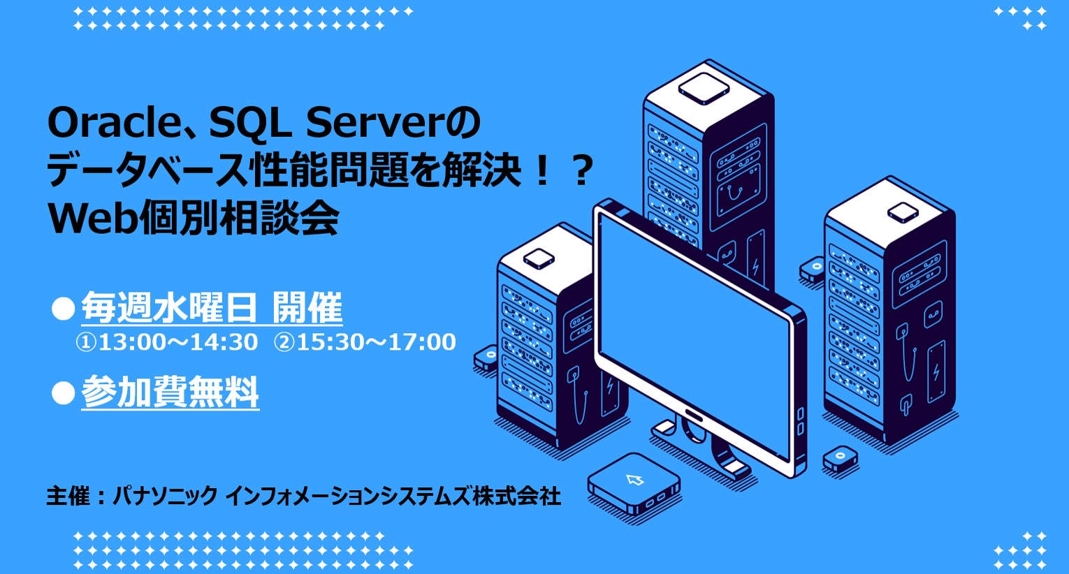 パナソニック インフォメーションシステムズ株式会社は、2023年1月25日(水)から2023年3月29日(水)にかけて各回1社限定の、データベース性能問題にフォーカスしたWeb個別相談会を開催します。