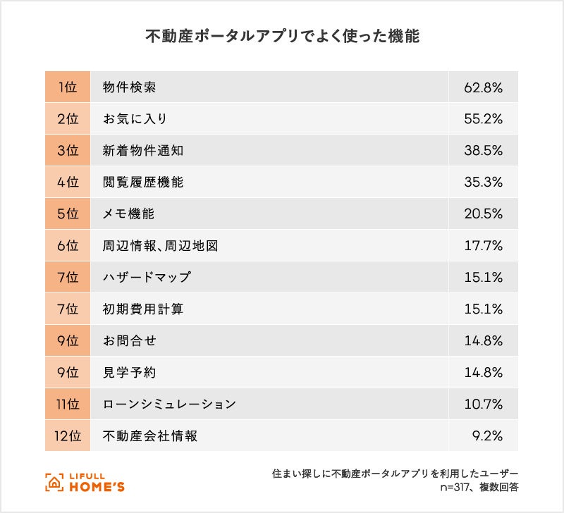 不動産ポータルアプリを利用していてよく使った機能を聞いたところ、物件検索(62.8%)やお気に入り(55.2%)といった機能のほか、新着物件通知(38.5%)などアプリならではの機能をよく活用していることが明らかになりました。過去に物件を検索した際の条件を保存したり、お気に入り機能で気に入った物件をすぐに見返すことができるなど、スキマ時間での住まい探しに不動産ポータルアプリが活用されていると考えられます。