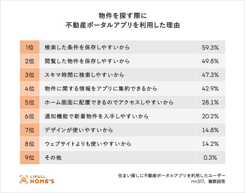 また、住まい探しに不動産ポータルアプリを利用する理由については、検索した条件を保存しやすい(59.3%)、閲覧した物件を保存しやすい(49.8%)、物件に関する情報をアプリに集約できる(42.9%)など、情報の保存や整理に関する理由が上位を占めたほか、スキマ時間に検索しやすい(47.3%)という、時間の有効活用に関する回答も多くありました。