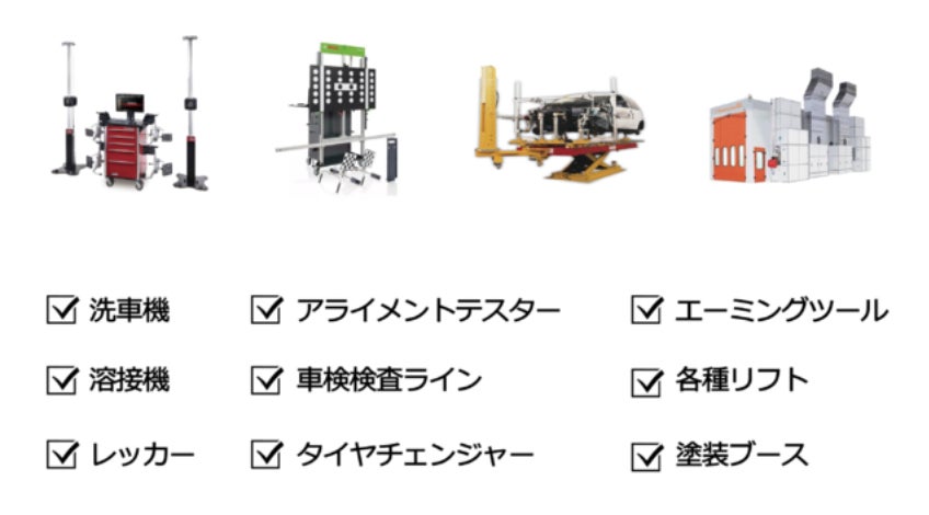 対象となる整備工具:エーミング機器、アライメントテスター、塗装ブース、リフト、フレーム修正機・測定器、レッカー、洗車機、車検検査ライン、タイヤチェンジャー、その他各種自動車整備機器