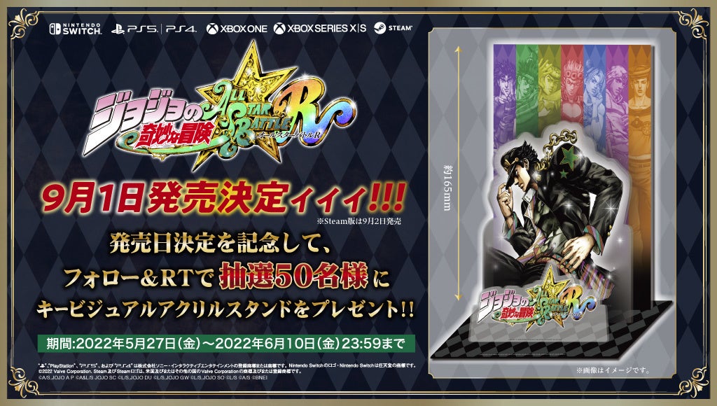 『ジョジョの奇妙な冒険 オールスターバトル R』の発売日決定を記念して、発売日決定記念Twitterプレゼントキャンペーンを実施!