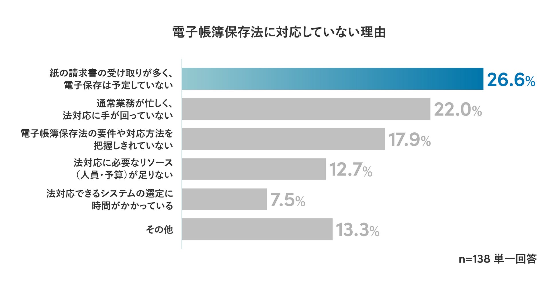 続いて、宥恕期間終了後も電子帳簿保存法に対応していない企業にその理由を聞いたところ、最も多かったのは「紙の請求書の受け取りが多く、電子保存は予定していない」(26.6%)でした。