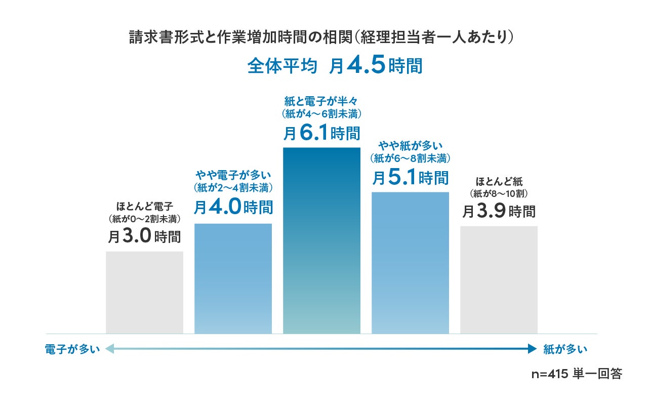 〜電帳法対応で、経理担当者の業務が一人あたり月4.5時間増加。紙と電子の混在による業務負担増が明らかに〜