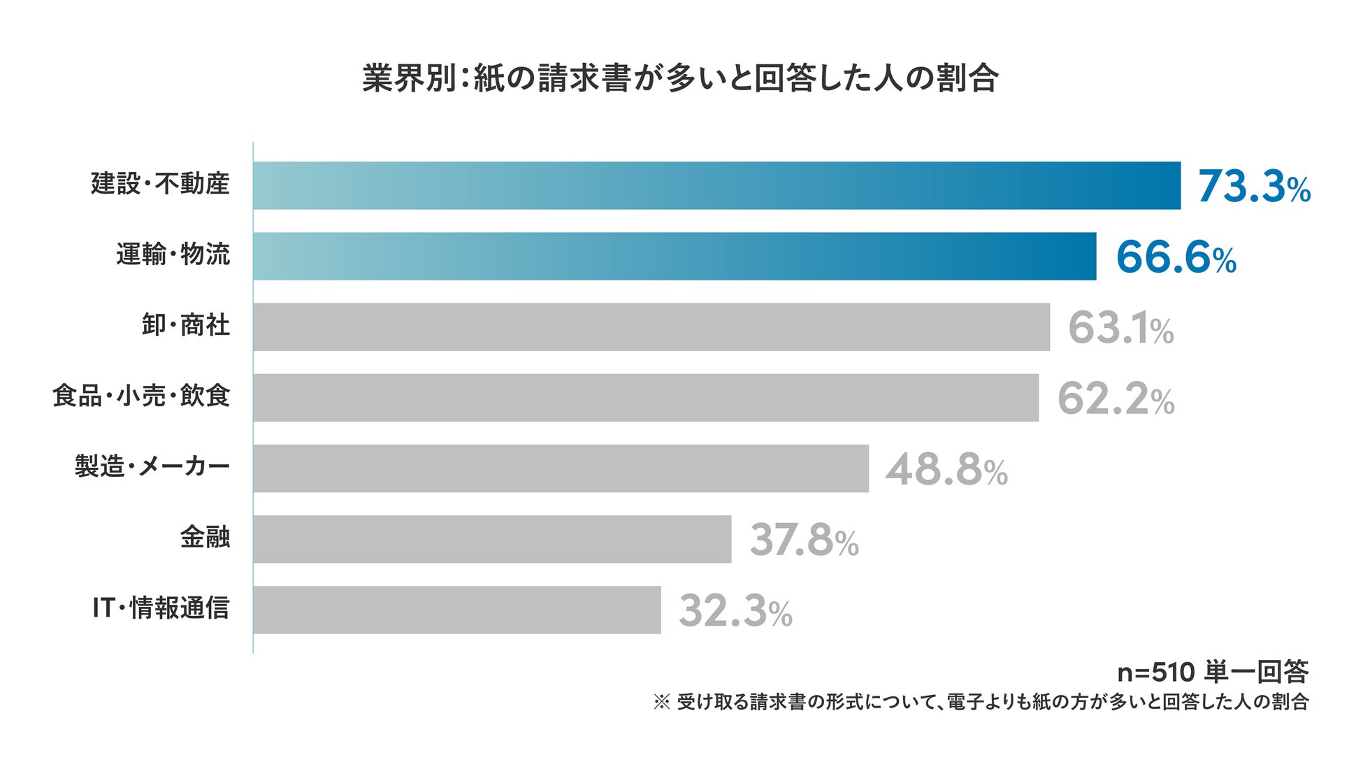 電子帳簿保存法に対応しない要因となっている「紙の請求書の受け取りが多い」に関して、業界動向を調査したところ、紙の受け取りが多い業界の第一位は「建設・不動産」、第二位は「運輸・物流」という結果でした。また、「卸・商社」および「食品・小売・飲食」業界でも、半数以上の人が受領する請求書の過半数が紙であると回答しており、いまだ多くの業界において紙文化が根強いことが分かりました。