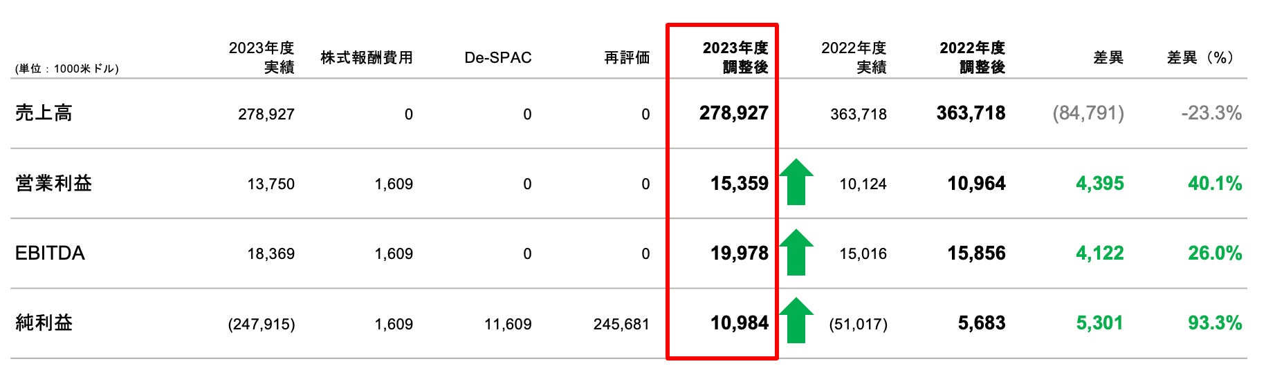・2023年度の純損失は2億4,790万米ドル。2億5,870万米ドルの営業外費用によるものであるが、これは主に現金支出を伴わない会計処理としての金融負債の再評価損(優先株および新株予約権を含む)および一過性のDe-SPAC関連費用によるもの