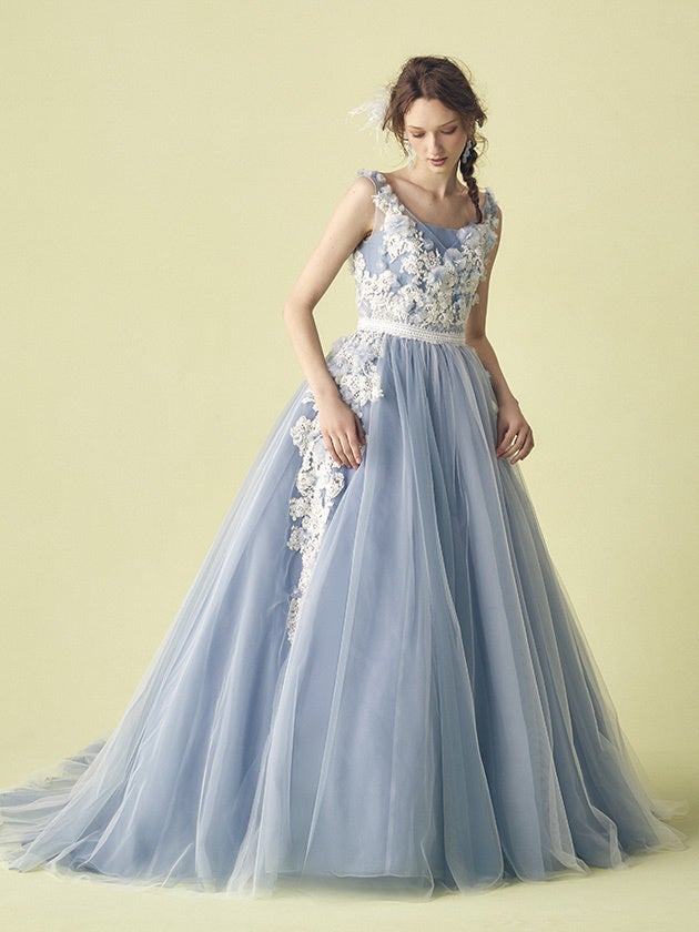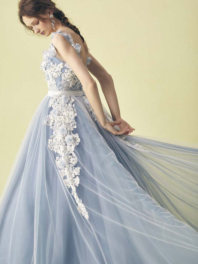 ニュアンスブルーにあしらった華やかなビジューレースは、花嫁を可憐なプリンセスに。トップスのフラワー付きVネックのオーバーブラウスを外すと、華やかなビスチェにチェンジできる2Wayドレスです。ほどよいボリュームチュールにもビジューレースをのせて、どこから見ても魅せるドレスです。