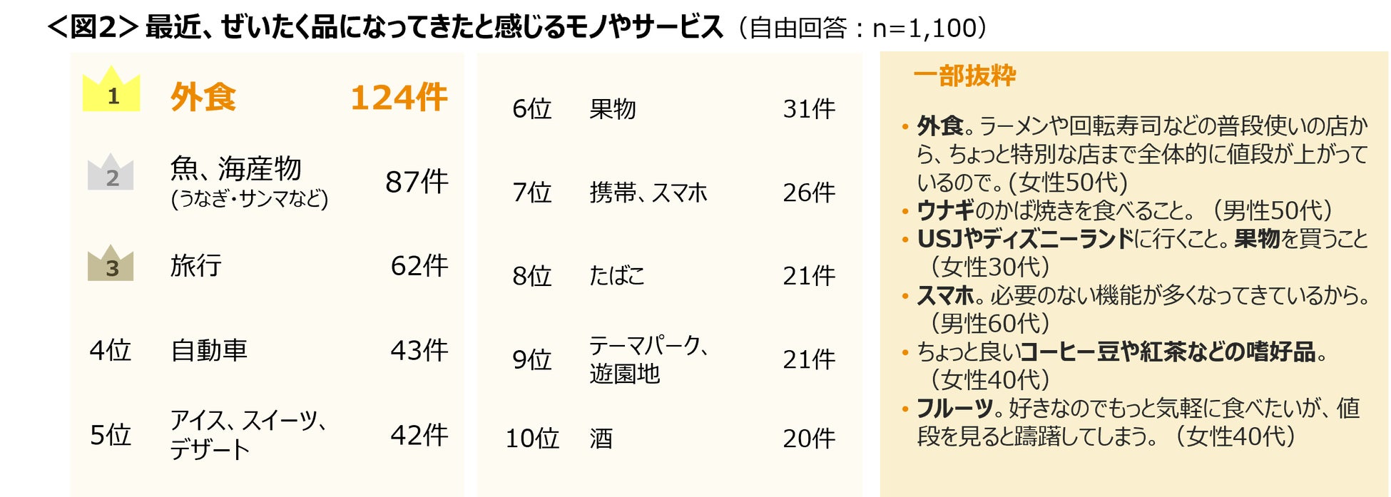 最近、ぜいたく品になってきたと感じるモノやサービスとしては「外食」が124件でTOP。「魚・海産物(うなぎ・サンマなど)」「旅行」「自動車」が続く。<図2>