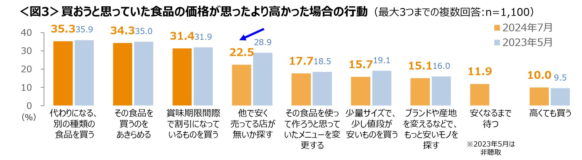 買おうと思っていた食品の価格が思ったより高かった場合、「代わりになる、別の種類の食品を買う」「その食品を買うのをあきらめる」「賞味期限間際で割引になっているものを買う」が3割台。