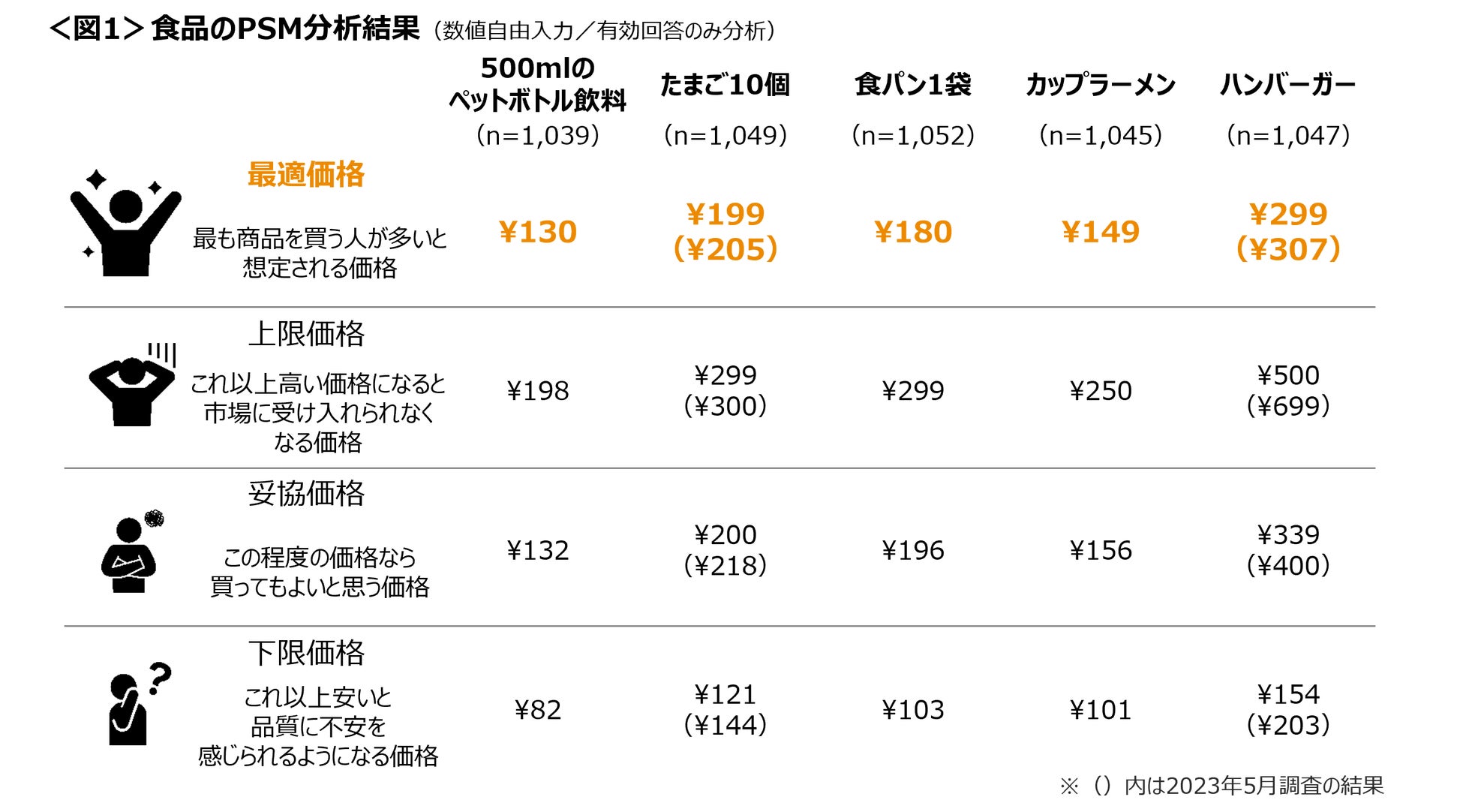 PSM分析の結果、食品の最適価格(最も商品を買う人が多いと想定される価格)は下記の通りとなった。500mlのペットボトル飲料:130円、たまご10個:199円、食パン1袋:180円、カップラーメン:149円、ハンバーガー:299円。