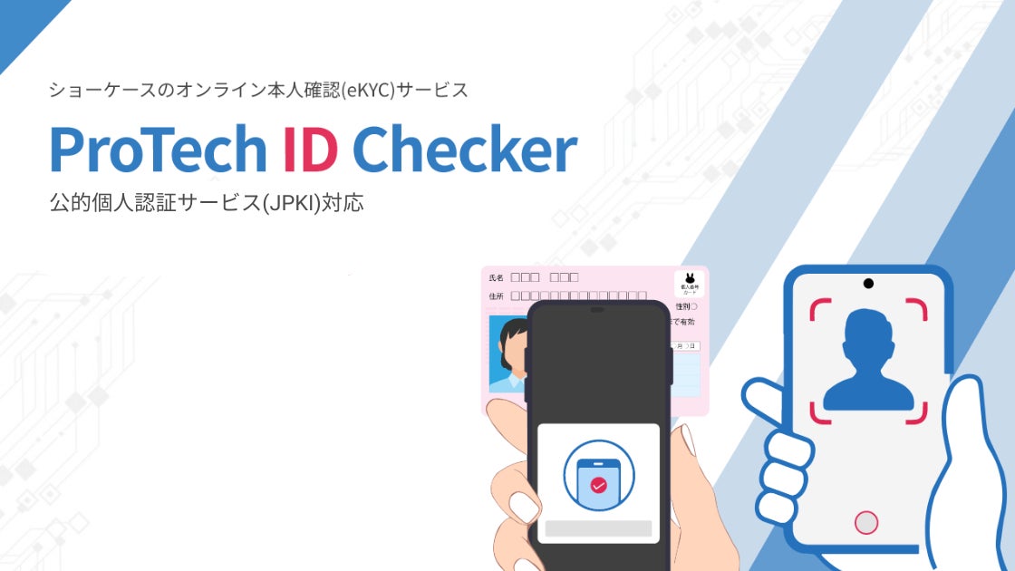 ショーケースが提供するオンライン本人確認/eKYCツール「ProTech ID Checker」は、銀行・証券の口座開設や携帯電話契約、古物買取、各種サービスの会員登録など、幅広い場面で本人確認をオンライン完結できる eKYCサービスです。マイナンバーカードのICチップを活用した公的個人認証(JPKI方式)に加え、顔撮影(セルフィー認証)と本人確認書類の照合にも対応。スマートフォンやPCブラウザからスムーズに本人確認手続きを行うことが可能です。