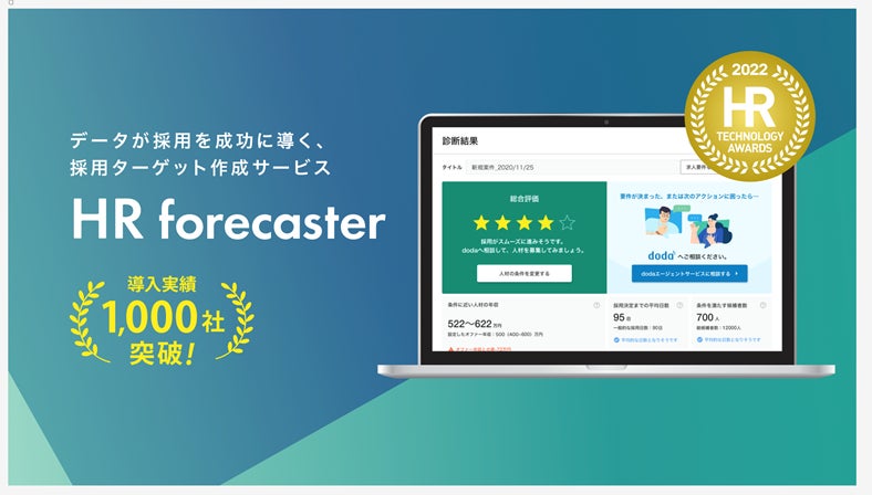 「HR forecaster」は、転職サービス「doda」が蓄積してきた100万件以上の転職データから作成した統計データを活用して、転職マーケットに即した求人要件を作成できるサービスです。企業が作成した求人要件を「HR forecaster」の統計データで分析することで、採用難易度が可視化され、転職マーケットに即した適切な求人要件に見直すことが可能となります。これにより、採用成功率の向上や採用期間の短縮化を実現します。2021年11月のサービス提供開始から導入企業は右肩上がりで増加し、約半年で1,000社を突破し、業種やエリア、企業規模問わず、幅広い企業が活用しています。