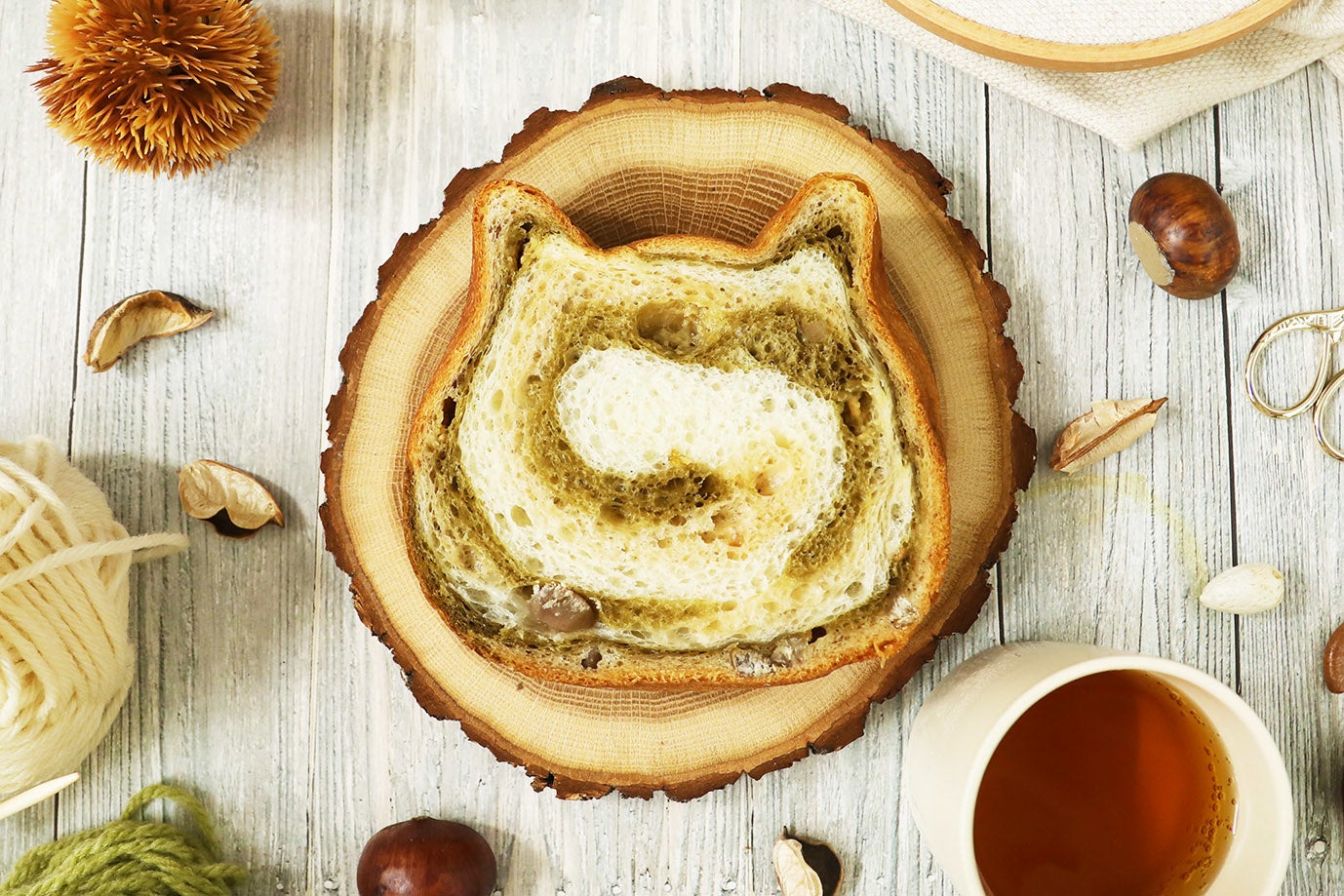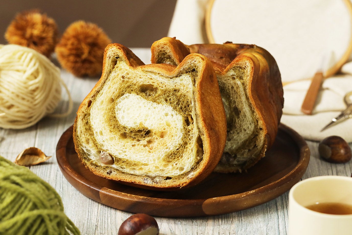 ほうじ茶の香ばしさと優しい苦みが、栗やホワイトチョコの甘さをより引き立て、栗とほうじ茶の絶妙なハーモニーをお楽しみいただける秋にぴったりなねこねこ食パン。