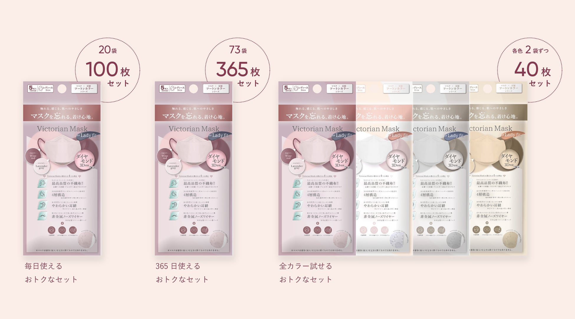 耳紐カラーと本体カラーがツートンカラーになった女性にぴったりフィットするサイズ感のVictorian maskがおトクに購入できるセット商品が新登場。