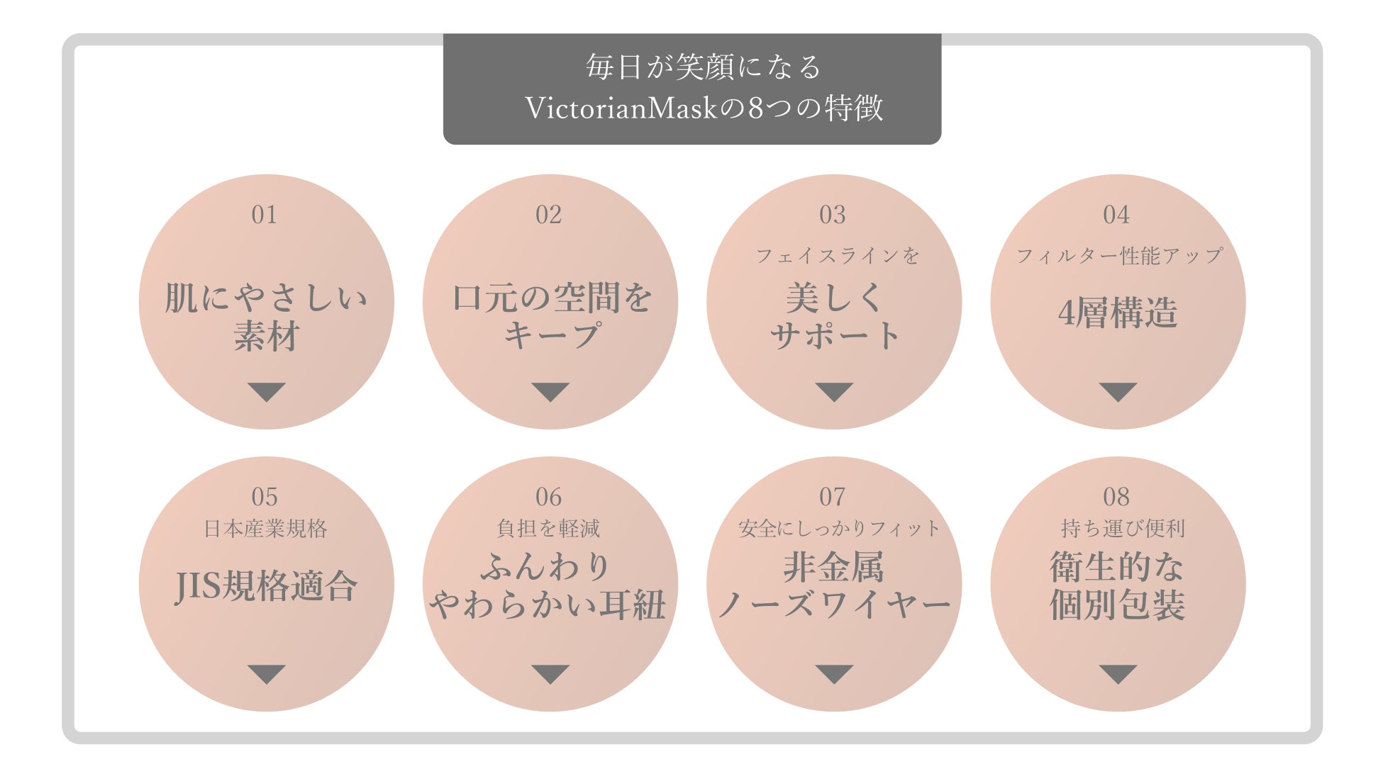 マスク生活が当たり前となった暮らしの中で、ファッション性と機能を両立させ、毎日のコーデを楽しむ女性向けマスク。ご愛顧いただいてるお客様には勿論、Victorian Maskをまだお試しになっていないお客様も、ぜひこの機会にお試しください。