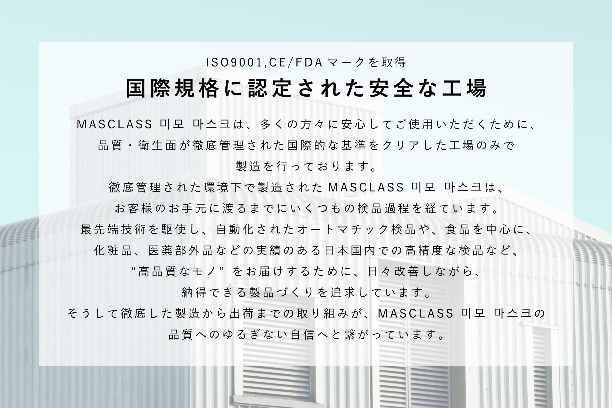 MASCLASSは、EUやアメリカなど世界各国の基準に応じて定められた規格、基準をクリアし、安全性が高く、品質の高い製品が製造できる証を取得した工場で製造されています。