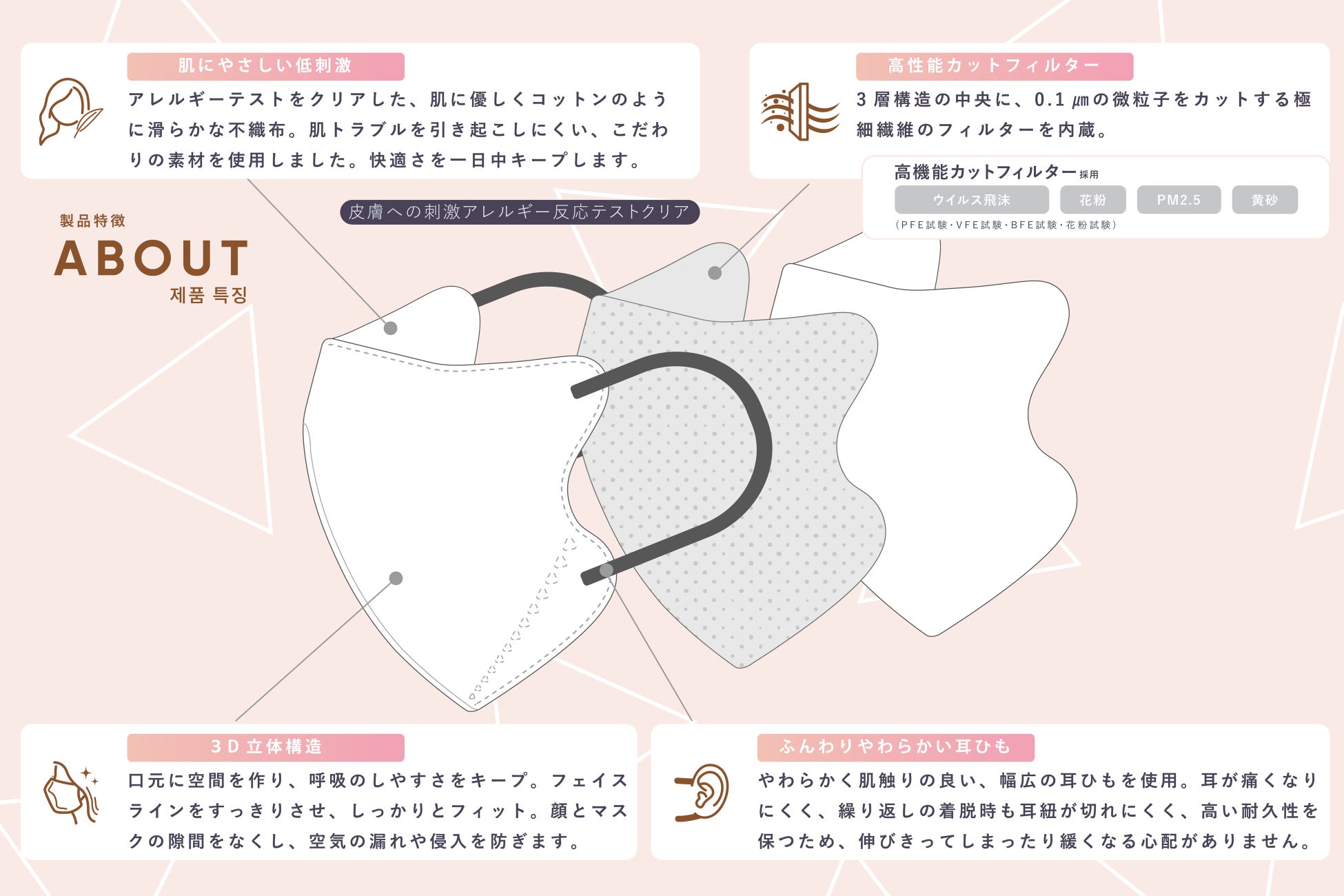 マスク本体と耳ひもがツートンカラーになった2つの配色は、落ち着いた色の組み合わせによって女性らしい印象を演出します。約0.1㎛(マイクロメートル)サイズの粒子を99.9%ろ過(捕集)できるフィルターを採用し、国際的な基準を満たした証明のISO(9001)と、適正な商品であることを証明するCE/FDAマークを取得し、徹底した品質管理の下に生産された安全な不織布マスクです。