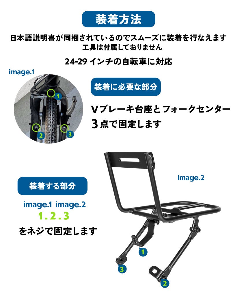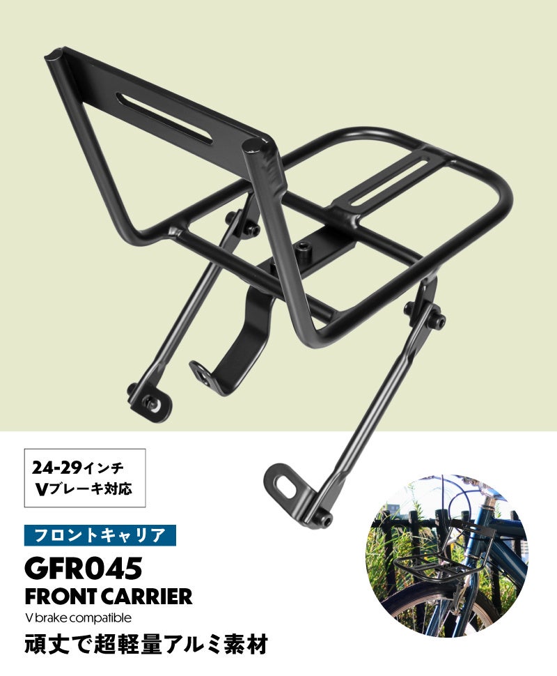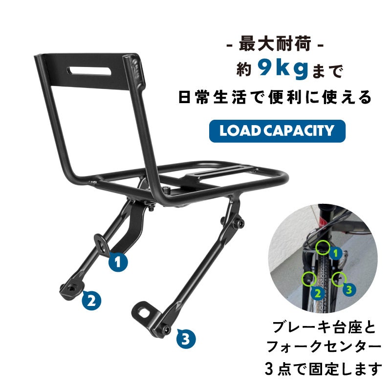 スポーツ自転車でのツーリングやお買物が多い街乗りにぴったりのフロントキャリアです。Vブレーキ台座とフォークセンターの3点に固定します。