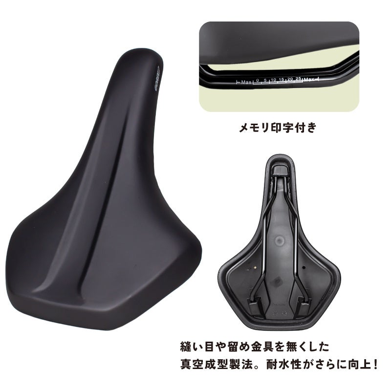 どっしり座れる幅広座面とクッション性が抜群、そしてシンプルでスポーティーなデザインです。厚めのクッションで、長時間座っていてもお尻の痛みがでにくい、コンフォート性を重視したロングライド向きのサドルです