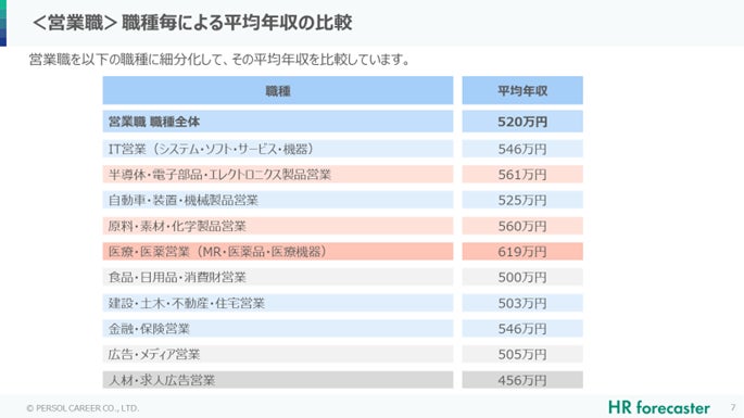 ①【職種別平均年収】トップは、医療・医療営業(MR・医薬品・医療機器)で619万円