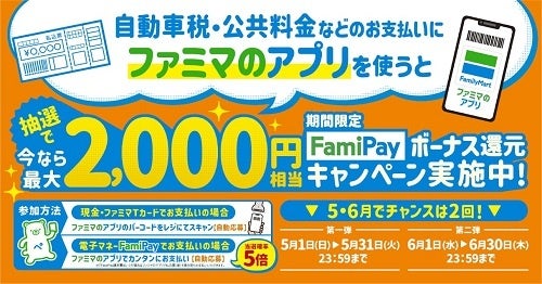 5月1日(日)~6月30日(木)までのキャンペーン期間中(第1弾:5月1日(日)~5月31日(火)、第2弾:6月1日(水)~6月30日(木))に自動車税など各種料金をお支払いの際、ファミマのアプリをご提示してお支払いいただくと、抽選で総額1,000万円相当の期間限定FamiPayボーナスがあたるキャンペーンを実施いたします。