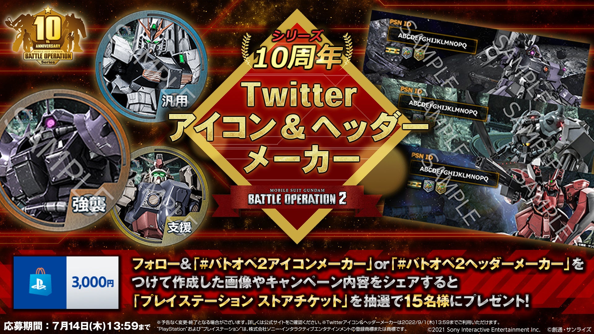 期間中、バトオペ2公式Twitter(@gundambattleope)をフォローしていただき、「#バトオペ2アイコンメーカー」、もしくは「#バトオペ2ヘッダーメーカー」をつけてツイートいただくと、抽選で15名様に「プレイステーション ストアチケット」3,000円分をプレゼント!