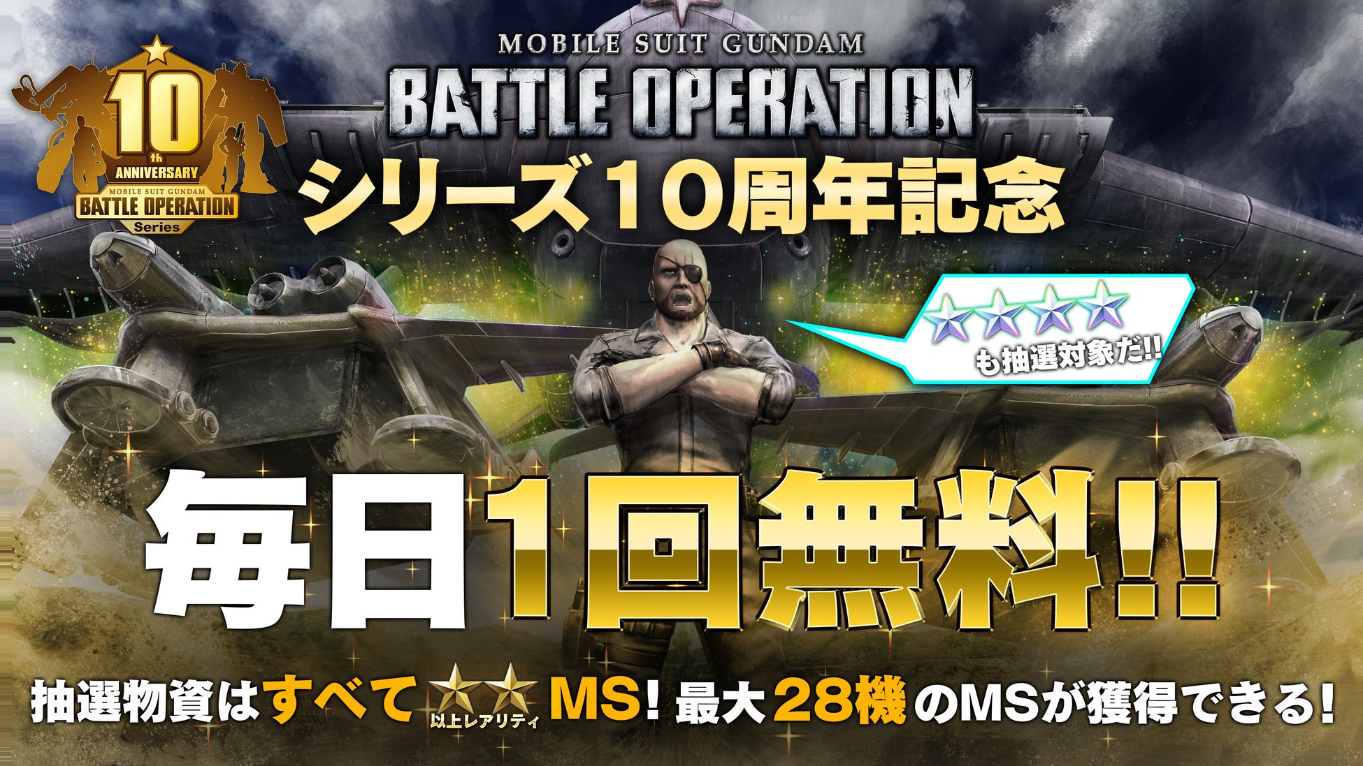 『機動戦士ガンダム バトルオペレーション』シリーズの10周年を記念した本キャンペーンは、毎日1機無料でMSが獲得できる抽選配給の実施など盛りだくさんな内容となっています。