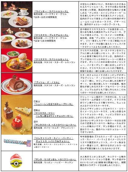 今年のクリスマスは、特別な日に「これが食べたい!」がすべて叶う、パークだからこそ実現できるバリエーション豊かなフードをご用意。見た目や味のクオリティにこだわり抜いたクリスマス・メニューで、心も 身体も満たされる“超興奮”の食体験をお楽しみいただけます。レストランやエリアのテーマに浸れるよう、細部までこだわったフードは常に人気を集めています。この冬は、格調高いフルサービスレストランで味わう、シェフ渾身の“アンガス・エイジングステーキ”のスペシャルコースや、家族や友だちとクリスマス気分を 大満喫できるローストチキンのプレートが初登場。さらに、ツリーやオーナメントでかわいいデコレーションを施し、大人の味わいを加えた新作ケーキ、SNS映え間違いなしのコラボフードや食べ歩きフードなど、限界を設けずこれまでにないアイデアで誕生させた冬限定メニューで“心アツくなる”新体験にご期待ください。