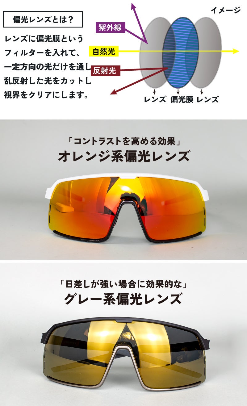 光り反射や眩しさを抑えるのが特徴の偏光レンズを採用したスポーツサングラスです。