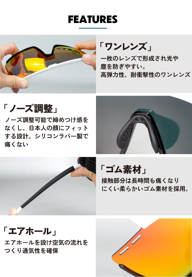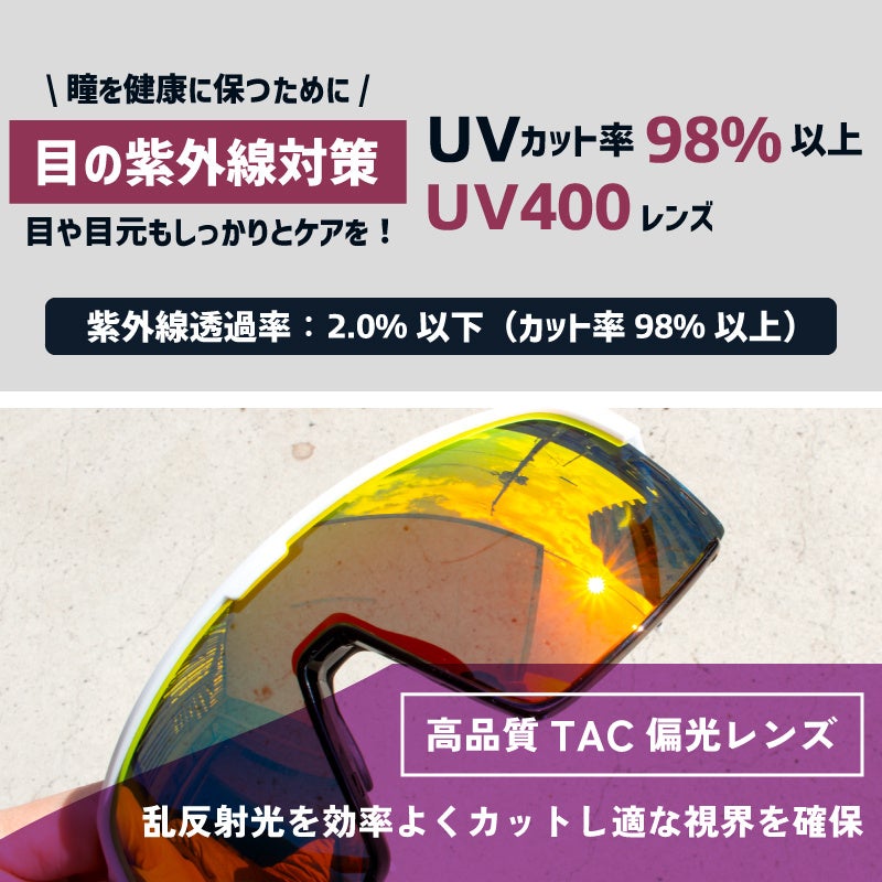 光り反射や眩しさを抑えるのが特徴の偏光レンズを採用したスポーツサングラスです。さらにレンズに紫外線カットUV400を採用し目のケアにも有効です。目の疲れを抑えて快適なスポーツをサポートします。